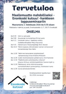 Enonkoski kutsuu! -hanke päättyy helmikuun lopussa 2026. Hankkeen loppuseminaari järjestetään maanantaina 2. helmikuuta klo 8.30 alkaen. Paikkana on Maitolaituri kahvila ja puoti, osoite Enonkoskentie 11T, 58175 Enonkoski.